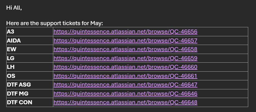 An example of the email format for QCALL is shown in the image below. This typically includes a structured list of the new tickets by customer.